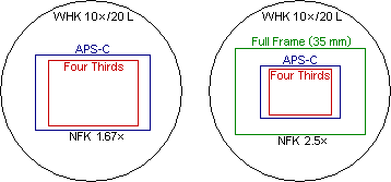 For digital SLRs with a Four Thirds sensor (17.3×13.0 mm, diagonal 21.6mm), the most appropriate photo eyepiece is also the NFK 1.67×, but the small sensor means that the camera’s field of view is substantially smaller than the viewing eyepieces.