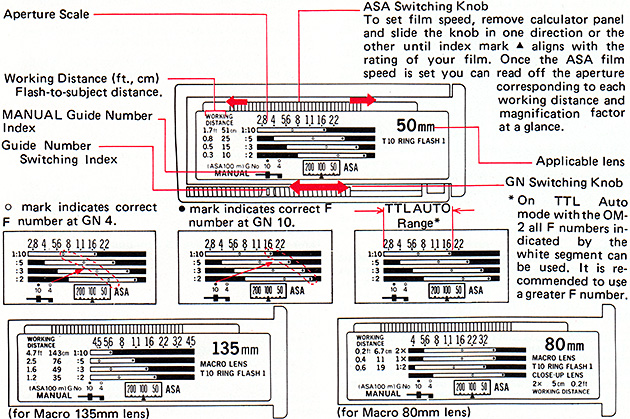 When the Power Control was introduced, the only macro flash was the T10 Ring Flash 1, and a calculator panel was supplied for non-automatic flash with the T10 and 50mm lenses (including the Zuiko Auto-Macro 50mm f/3.5). After the other macro flash units were introduced, a page of self-adhesive labels was supplied; these include new distance and aperture scales for the various flash unit/macro lens combinations. There was also a calculator panel for 50mm lenses with the T28 Macro Single Flash 1. For TTL Auto use, the calculator panels for the T32 Electronic Flash can be used.