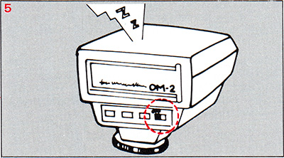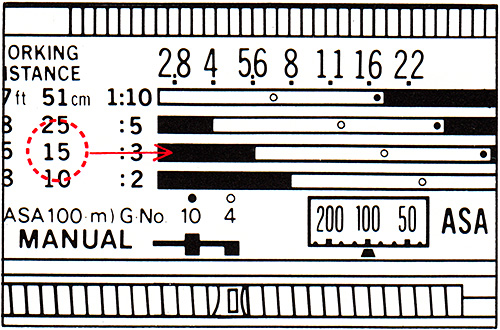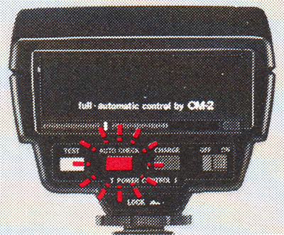With the calculator panel in the ‘full automatic control by OM-2’ position, the guide number is set automatically to 10 (ASA 100, meters) or 33 (ASA 100, feet).