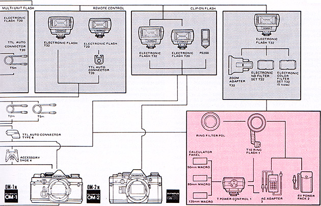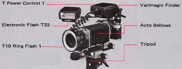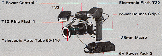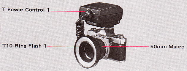 The T Power Control 1/T10 Ring Flash 1 combination is specially designed for short working distances where conventional flash units cannot be used. With the OM-2 it extends the advantages of TTL “OTF” Auto flash to the fields of shadowless close-up, medical, scientific and outdoor action macrophotography. Manual flash with the OM-1, OM-10 and cameras other than OM can also be achieved more easily than ever before.
