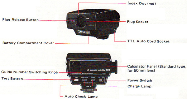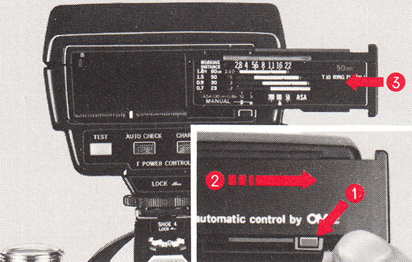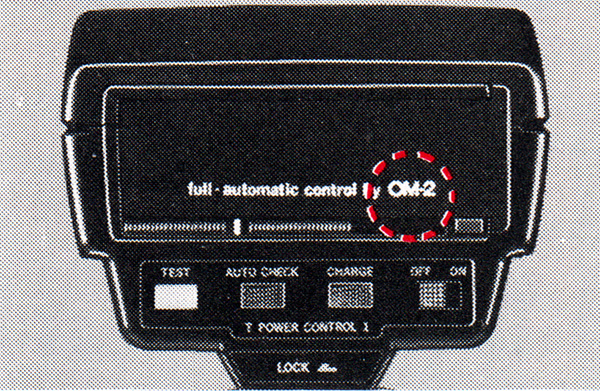 The Power Control is capable of conventional (non-TTL) automatic flash exposure, using the sensor in the “O” of the Olympus badge, if a calculator panel from a T32 flash is installed. However, this is not likely to work well because the macro flashes and bellows or macro lenses block the sensor, and because the extra exposure required by magnification will not be applied.