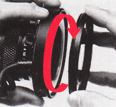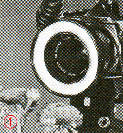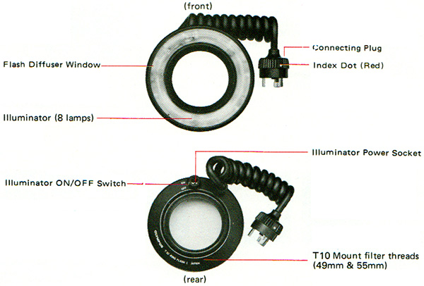 Illuminators: Eight electric bulbs are built into the front of ring flash unit. (Power source: 6V Power Pack 2 or AC Adapter 3).